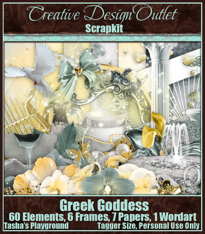 Tasha has made available again her amazing Greek Goddess kit that had been retired. This is stunning in ethereal tones of gold, green, and yellows that will transport you back to the beautiful land of Greece with its ancient artifacts as you stroll along the promenade and stop to sit and admire the fountains to make your wishes.
